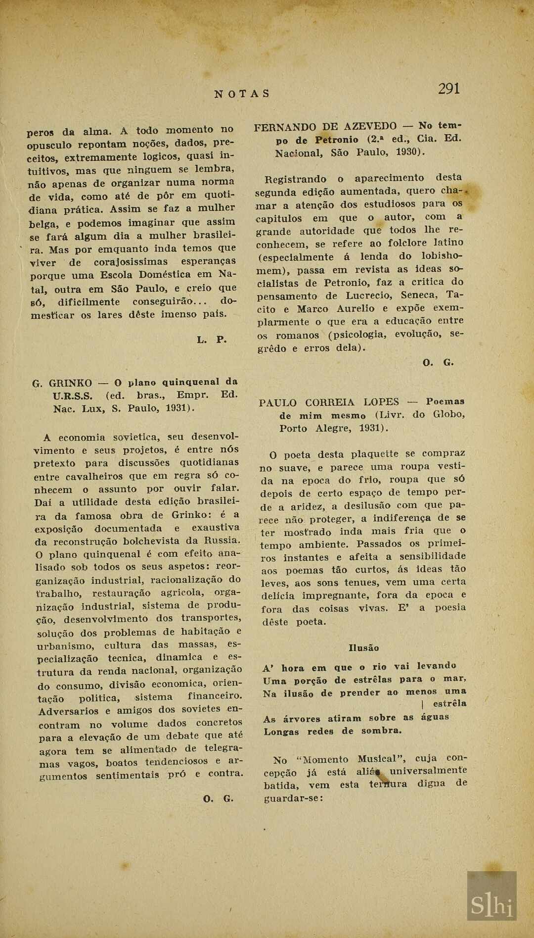 Descrição físicapp. 290-291SumárioExperiências que alunas brasileiras tiveram na escola doméstica na Bélgica e como o Brasil se via carente num ensino como este.ConceitosAssuntosNomes Singulares CitadosNomes Colectivos CitadosNomes Geográficos Descrição físicap. 291SumárioApresentação da famosa obra de Grinko sobre economia na União Soviética.ConceitosAssuntosNomes Singulares CitadosNomes Colectivos CitadosNomes Geográficos Descrição físicap. 291SumárioComentário sobre a segunda edição da obra sobre folclore latino.ConceitosAssuntosNomes Singulares CitadosNomes Colectivos CitadosObrasNomes Geográficos Descrição físicapp. 291-292SumárioNota a respeito da nova obra poética de Paulo Correia.ConceitosAssuntosNomes Singulares CitadosNomes Colectivos CitadosObrasNomes Geográficos