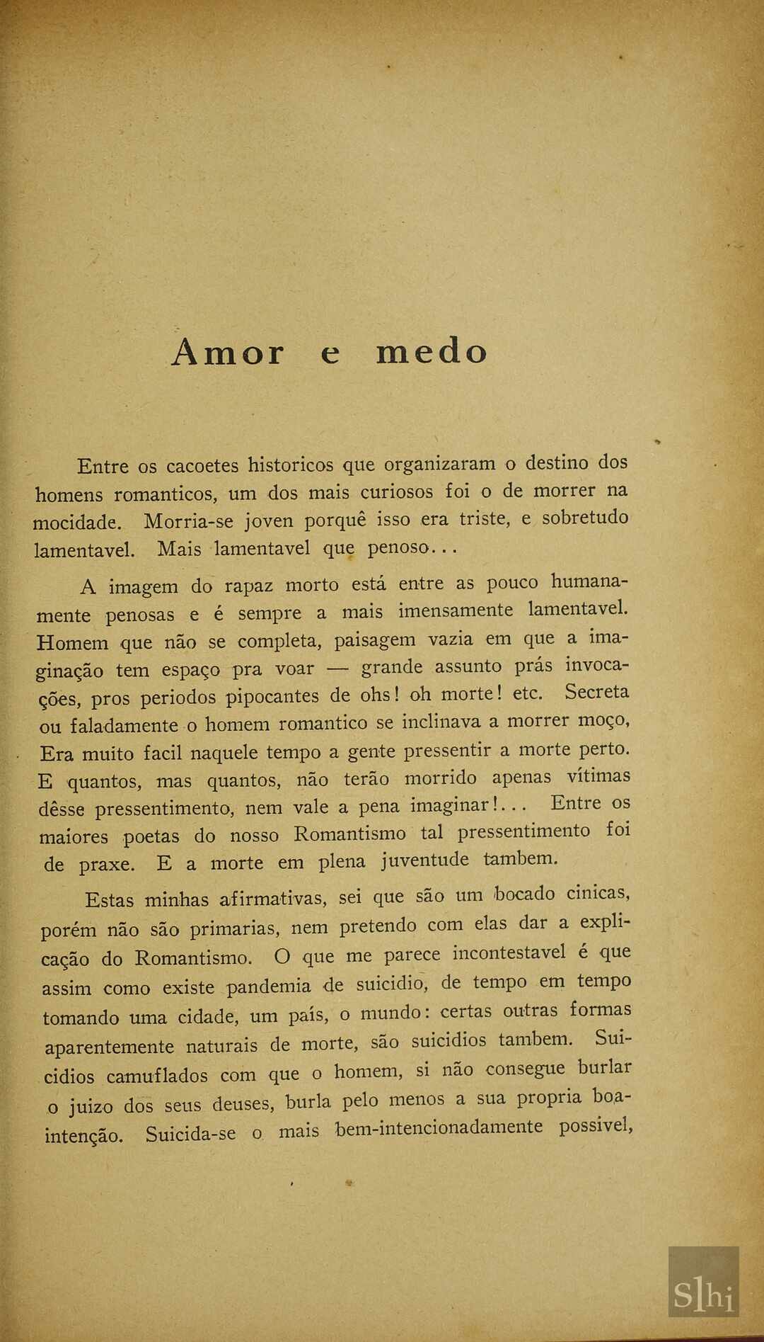 O autor se debruça ao tema do amor nas obras do romantismo, e em especial de Álvares de Azevedo, comparando-a com as de Casimiro de Abreu, Gonçalves Dias e Castro Alves.