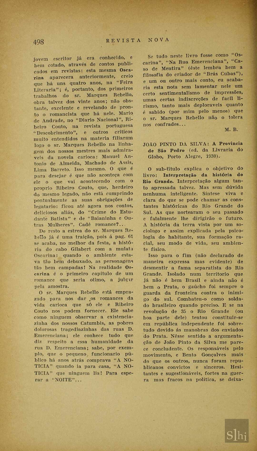 Descrição físicapp. 497-498SumárioResenha sobre a estreia literária de Marques Rebello, que Manuel Bandeira diz ser tão bom quanto as novelas cariocas de Machado de Assis e Lima Barreto.ConceitosAssuntosNomes Singulares CitadosObras Descrição físicapp. 498-500SumárioO livro resenhado tem o intuito de demonstrar uma interpretação acerca da história do Estado do Rio Grande do Sul, sendo elogiado pelo autor.ConceitosAssuntosNomes Singulares CitadosObrasNomes Geográficos