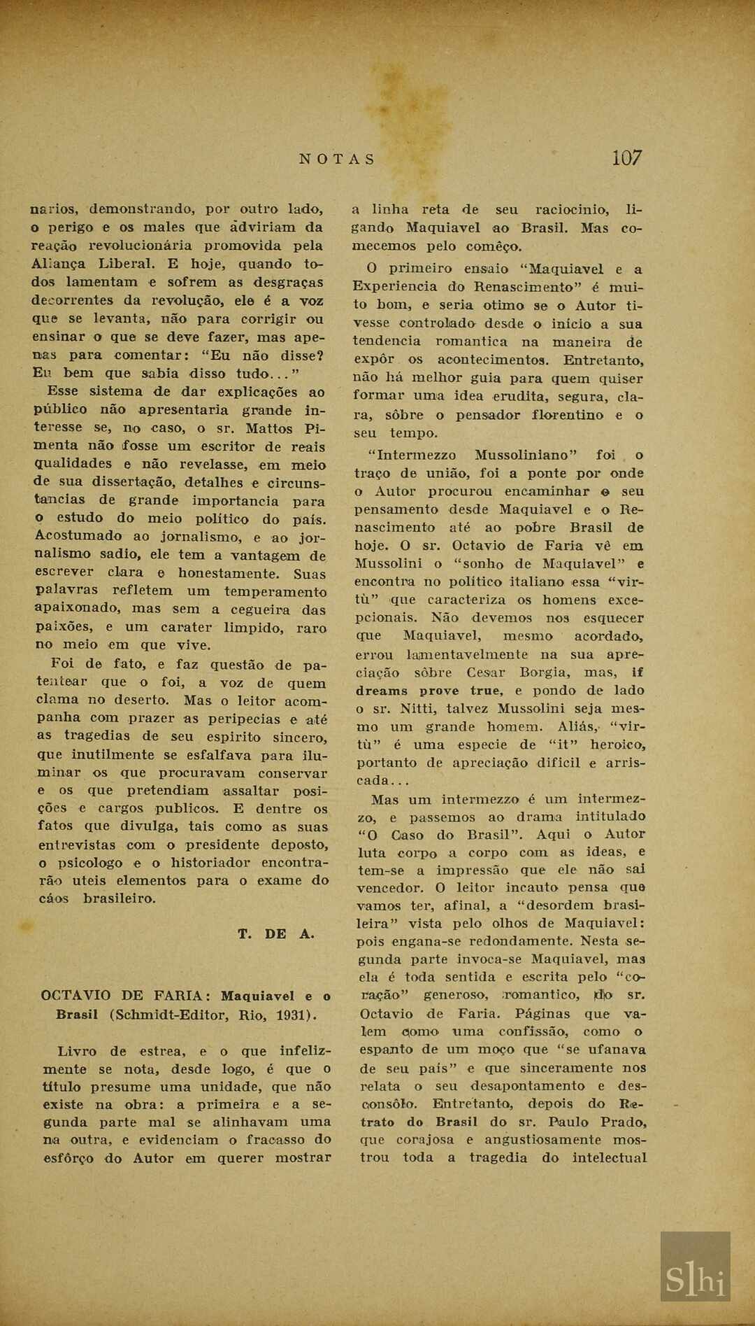Descrição físicapp. 106-107SumárioResenha sobre a obra de Mattos Pimenta que denuncia detalhes do movimento da Aliança Liberal deflagrado em 1930.ConceitosAssuntosNomes Singulares CitadosNomes Colectivos CitadosObrasNomes Geográficos Descrição físicapp. 107-108SumárioCrítica ao livro de Octavio de Faria que erroneamenta lança comentários "mal intencionados" a respeito do modernismo brasileiro, fugindo radicalmente do tema central proposto pela obra, de acordo com Carlos Pinto Alves.ConceitosAssuntosNomes Singulares CitadosNomes Colectivos CitadosObrasNomes Geográficos