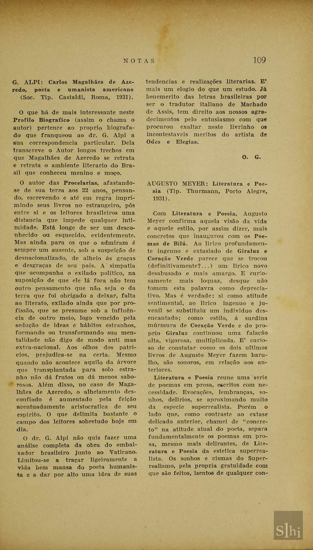 Descrição físicap. 109SumárioResenha sobre a obra de Magalhães de Azeredo que versa sobre um perfil biográfico de G. Alpi.ConceitosAssuntosNomes Singulares CitadosNomes Colectivos CitadosObrasNomes Geográficos Descrição físicapp. 109-110SumárioAnálise sobre a poesia lírica de Augusto Meyer em seu novo livro, considerado superior aos anteriores, segundo Mário de Andrade.ConceitosAssuntosNomes Singulares CitadosNomes Colectivos CitadosObrasNomes Geográficos