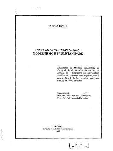 Terra Roxa e outras terras: modernismo e paulistanidadeFabíola Picoli, Dissertação de Mestrado em Letras, Campinas, São Paulo, Unicamp, 1997.