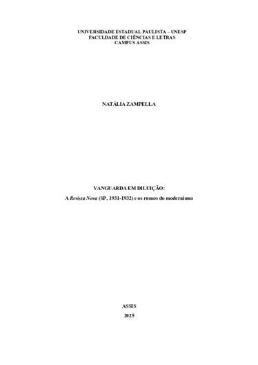 Vanguarda em diluição: A Revista Nova (SP, 1931-1932) e os rumos do modernismoNatália Zampella, Dissertação de Mestrado em História, Assis, Faculdade de Ciências e Letras, Universidade Estadual Paulista (UNESP), 2025.