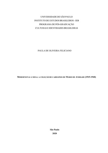 Modernistas à mesa: a coleção de cardápios de Mário de Andrade (1915-1940)Paula de Oliveira Feliciano, Dissertação de Mestrado em Estudos Brasileiros, São Paulo, Instituto de Estudos Brasileiros, Universidade de São Paulo, 2020.